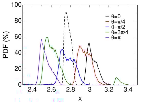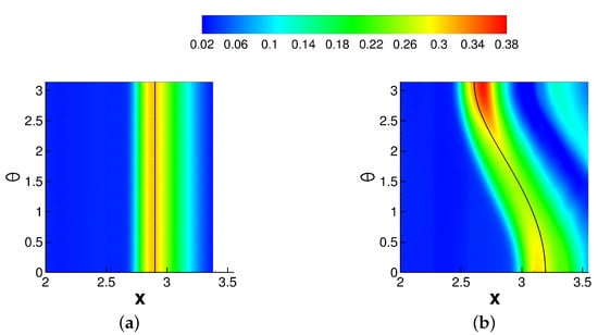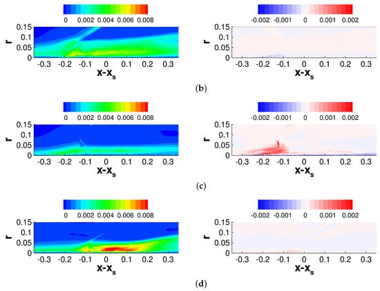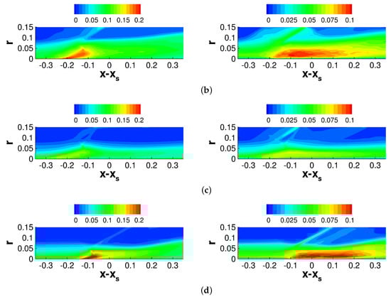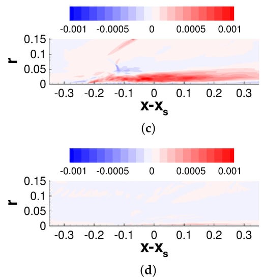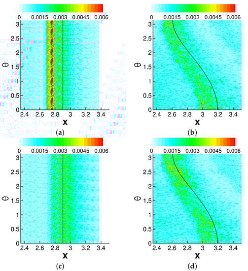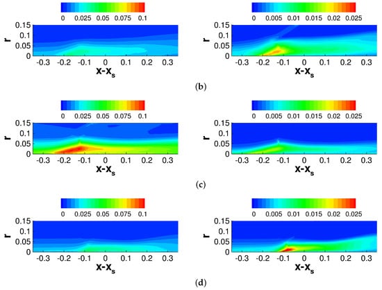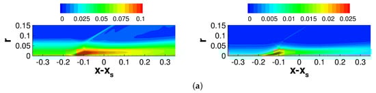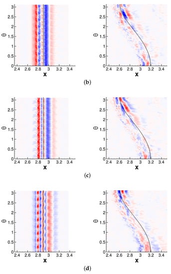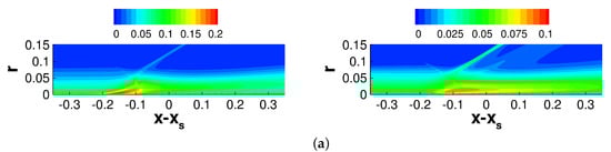 The offset position, , is zero for the axisymmetric interaction and for the asymmetric interaction. Furthermore, is the axial location of the tip of the shock generator and is the shock angle. The shock angle was obtained from a numerical solution of the Taylor–Macoll equation []. For both cases, the pressure increases upstream of the inviscid impingement line. While the pressure increase is independent of the azimuth for the axisymmetric interaction, for the asymmetric interaction it varies strongly in the azimuthal direction. In agreement with Sasson et al. [], the pressure increase is strongest on the side that is closest to the shock generator () and smallest for , where the impingement line is highly swept with respect to the freestream direction. The pressure increase is followed by an expansion and, for the asymmetric case, a secondary weaker pressure increase.