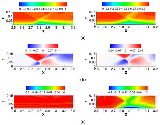 Iso-contours of (a) axial, (b) radial, and (c) tangential velocity for axisymmetric interaction [] (left) and asymmetric interaction at (right).