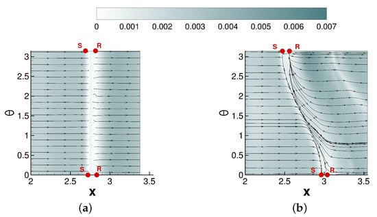 Contours of the magnitude of the skin-friction coefficient and skin-friction lines are shown in Figure 11. For the axisymmetric interaction, the separation and reattachment lines are straight (the end points are labeled “S” and “R” in the figure). For the asymmetric interaction, a saddle point (“S”) and node (“R”) of reattachment are located at both and . Lines of separation and reattachment that originate from the critical points converge near suggesting that the separation does not cover the entire azimuth. According to Tobak and Peake [], since the separated flow regions close without a critical point, they can be classified as “open”. The lines of separation and reattachment are not parallel to each other but diverging away from . According to the classification by Settles [], swept interactions with diverging separation and reattachment lines are classified as “conical”.