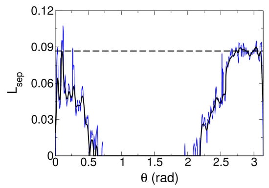 Axial separation length for the asymmetric (solid lines) and axisymmetric (dashed line) case []. The blue line represents the unfiltered data for the asymmetric case.