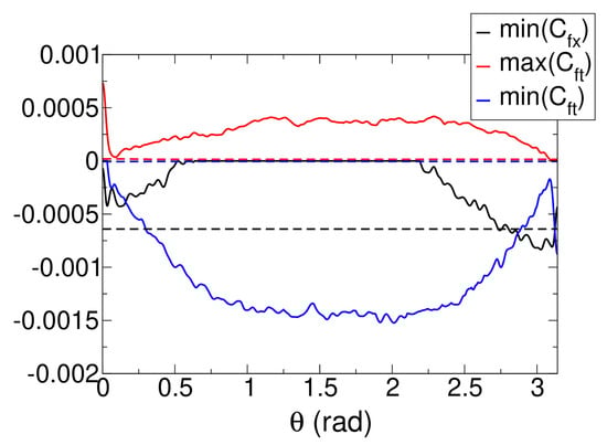 In Figure 15, the minimum axial skin-friction coefficient (), as well as the minimum and maximum azimuthal skin-friction coefficients () are plotted as functions of the azimuth angle. For the axisymmetric interaction, all three quantities indicate symmetry in the azimuthal direction. For the asymmetric interaction, the axial skin-friction coefficient goes negative (indicating recirculation) near the domain boundaries ( and ). For the side that is closer to the shock generator (), the axial skin-friction coefficient exhibits a more negative value. This is also the only region where the magnitude of the axial skin-friction coefficient exceeds that of the axisymmetric interaction. The azimuthal skin-friction coefficient obtains a large negative value near , again indicating a substantial flow away from the high-pressure region at .