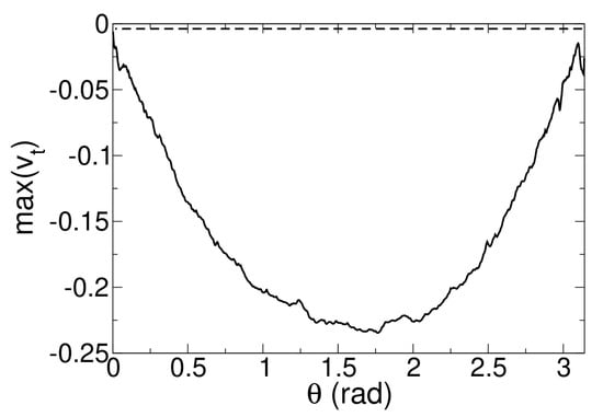 In Figure 16, the minimum (in x and r) azimuthal velocity, , is plotted against the azimuth. The asymmetric interaction exhibits a region of intense crossflow near where the azimuthal velocity is about 23% of the approach freestream velocity.