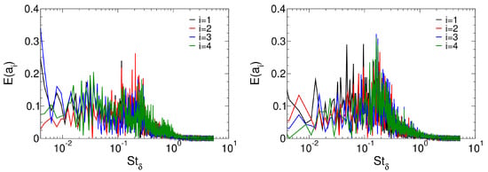 The “snapshot” method by Sirovich [] is well suited for the analysis of discrete time sequences from simulations and was also employed for the present analysis. The POD kernel was based on the wall-pressure coefficient, such that the magnitude of the POD eigenvalues, , is of order . The POD then provides an energy-optimal decomposition that captures the largest amount of kinetic energy with the least number of modes.