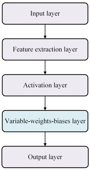 As shown in Figure 1, the VWB Net contains the core layers—the variable-weights-biases layer and auxiliary layers—an input layer, an output layer, and feature extraction layer. Before the formula, it should be noted that in the forward propagation process, the input of each layer is the output of the previous layer. For back propagation, the output loss of each layer is the input loss of the next layer.
