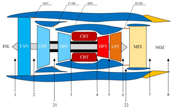 The basic structure and design point of the variable cycle engine are the same as that in Aygun and Turan’s paper [31]. VCE structure is depicted in Figure 4. Mode Switch Valve (MSV), Forward Variable Bypass Ejector (FVBE), and Back Variable Bypass Ejector (BVBE) are used to control VCE operating modes. Core Driven Fan (CDF), High-Pressure Compressor (HPC), and High-Pressure Turbine (HPT) are coaxial. Fan (FAN) and Low-Pressure Turbine (LPT) are coaxial. Additionally, other major components of VCE include Inlet (INL), Combustion (CBT), Mixer (MIX), Nozzle (NOZ), and Bypass (BPS).