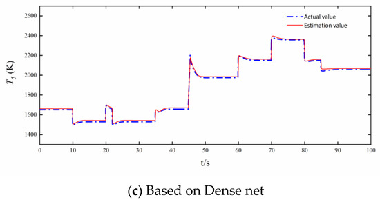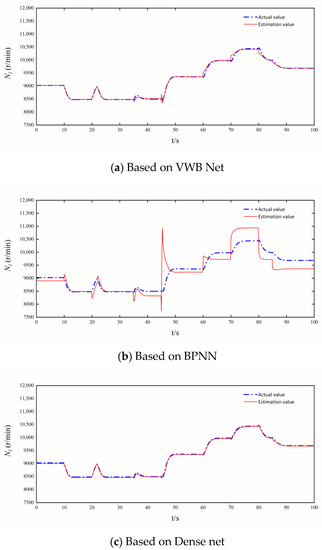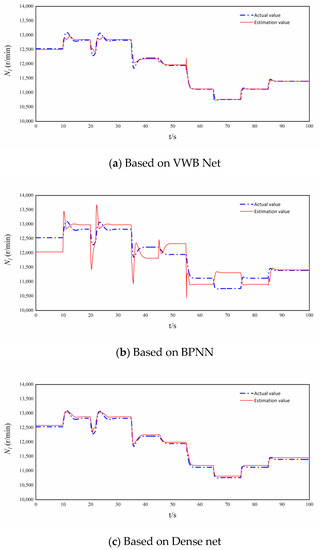 Figure 7, Figure 8, Figure 9, Figure 10, Figure 11 and Figure 12 show the steady and dynamic performance of , , and analytical redundancies based on VWB Net, BPNN, and Dense net. The analytical redundancies based on BPNN are not ideal, and the error of BPNN is far greater than the other two networks. BPNN cannot accurately estimate the dynamic process after the control variable changes instantaneously, and BPNN is the worst in analytical redundancy in Figure 9 and Figure 12. The error of the Dense net is relatively small, and the simulation curve of the Dense net is smoother than that of VWB Net. It is obvious that the VWB Net meets the requirement of the variable cycle engine for prediction accuracy.