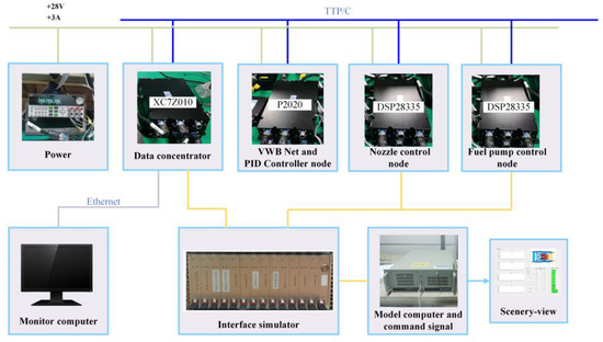 The hardware in loop simulation has higher simulation credibility which uses the real controller in the control system simulation, therefore, we can prove the feasibility of the proposed analytical redundancy method running on the real-time embedded controller and further verify the estimation accuracy and real-time performance of the VWB Net. Figure 13 demonstrates the block diagram of the hardware in the loop simulation for a distributed engine control system. The test platform is composed of an engine model computer, monitoring computer, interface simulator, data concentrator, power, and distributed control nodes. TTP/C communication bus is used to transmit data among nodes. The core controller node employs a dual-core processor module (P2020) based on NXP QorlQ P2020.