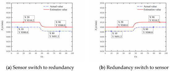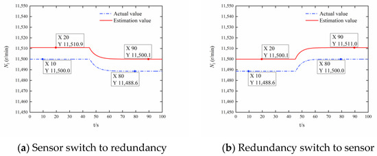 Table 5 shows the steady-state estimation accuracy of the analytical redundancy and the disturbance size of the actual value under two distinct flight conditions. The first condition is sea level with zero Mach number ( = 0 km, = 0), while the second condition is an altitude of 11,000 meters with a Mach number of 1.2 (= 11 km, = 1.2). Moreover, the engine mode used in this section is the dual bypass mode. We switch the controlled signal in the 45th s. The estimation accuracy and the disturbance size are less than 0.34%, meeting the requirements of VCE parameter estimation accuracy. The calculation time of the VWB Net each time in P2020 is 1.2 ms, meeting the requirements of real-time calculation. As shown in Figure 14, Figure 15, Figure 16 and Figure 17, when the controlled signal is switched between the sensor signal and the analytical redundancy signal, the engine can operate stably as before, meeting the requirements of engine-safe operation.