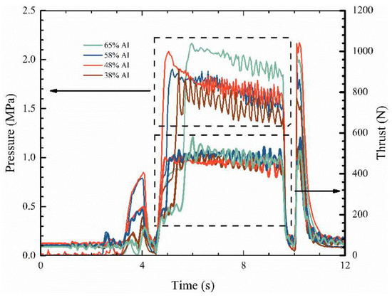Adding 58% of an aluminum additive to HTPB can significantly improve the regression rate and specific impulse of the hybrid rocket motor [15]. However, oscillations in the thrust of the propellant containing an aluminum additive are severer than those in the propellant without an aluminum additive [30]. The pressure of the combustion chamber and thrust of hybrid rocket motors with a high mass fraction of aluminum are shown in Figure 1. Unstable combustion is generated with the addition of a large number of aluminum particles. Moreover, the attendant oscillations do not occur as the motor starts operating but instead emerge after a certain duration of its operation. As combustion proceeds, the oscillations in thrust gradually increase and the average thrust increasingly varies. Adding a large number of aluminum particles to the fuel can increase the regression rate and specific impulse of the motor, but leads to the new problem of wide fluctuations in thrust that limit its use. Moreover, few closed-loop control systems use linear regulating valves for a high-performance hybrid rocket motor with HTPB-based fuel with aluminum additives. To fill this gap in research, we propose a closed-loop control system for a high-performance hybrid motor in this study. We design a closed-loop throttle control strategy to ensure constant thrust in the range of operation of the motor and a smooth transition during variable thrust.