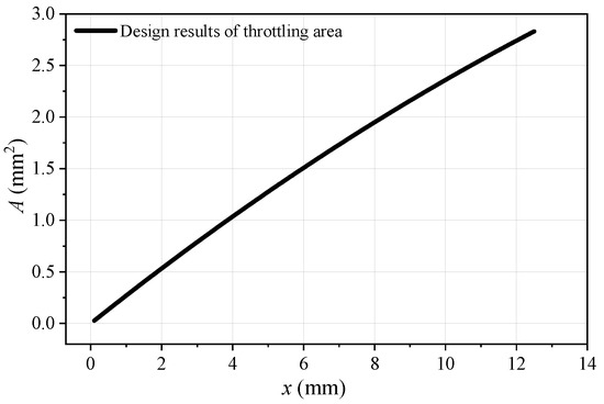 The variable-area cavitating venturi mainly consists of a servo motor, a transmission assembly, a pintle, and a venturi tube. The servo motor converts the rotational motion of the output shaft into the linear motion of the pintle through the transmission assembly, and the area of throttling changes with the linear motion of the pintle [32,33,34]. The relationship between the throttling area of the variable-area cavitating venturi and the pintle stroke is shown in Figure 4.