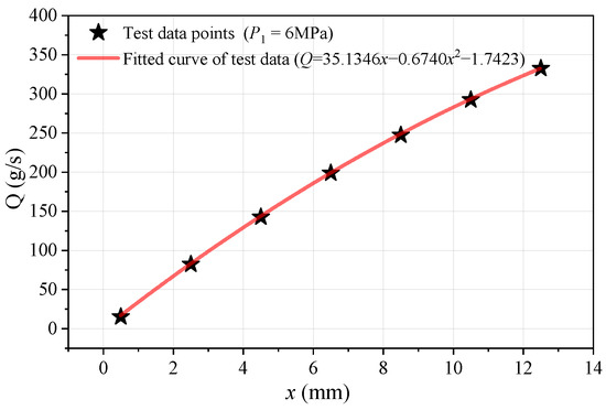 In Equation (6), Q is the mass flow rate (unit: kg/s), Cd is the coefficient of flow, A is the throttling area (unit: m2), ρ is the density of the liquid (unit: m2), p1 is the total pressure at the inlet of the variable-area cavitating venturi (unit: MPa), ps is the saturated vapor pressure of the fluid at a given temperature (unit: MPa), x is the pintle stroke (unit: mm), and a and b are constant coefficients measured by the cold flow test. In the test, the inlet pressure of the venturi was 6 MPa; the outlet pressure of the venturi was atmospheric pressure. The temperature of the ultrapure water was room temperature, about 15 °C. The results of the cold flow test of the variable-area cavitating venturi are shown in Figure 5.