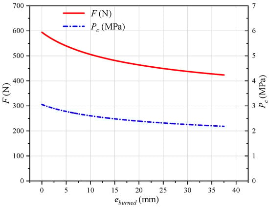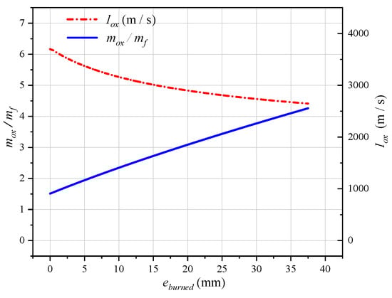 Curves of the specific impulses of the oxidizer for different web thicknesses of the burned grain are shown in Figure 7. The variation of Iox was due to the premises that the oxidizer flow rate was 160 g/s and that both the oxidizer-fuel ratio and pressure varied. As shown in the conclusion in reference [31], in hybrid rocket motors, the effect of combustion chamber pressure on the specific impulse was slight. Therefore, the effect of combustion chamber pressure on Isp and Iox was not considered in this paper. As the combustion of the tube grain proceeded, the oxidizer-to-fuel mass ratio gradually increased from 1.5 at the outset to 4.2. However, the specific impulse of the oxidizer gradually decreased from 3698 m/s to 2648 m/s. This indicates that an initial flow rate of the oxidizer of 160 g/s generated a thrust of 592 N, whereas at the end of the process, the same flow rate generated a thrust of 423.6 N: a 20.6% decrease in thrust. The correspondence between the thrust and the pressure of the combustion chamber, and the web thickness of the burned grain is shown in Figure 8.