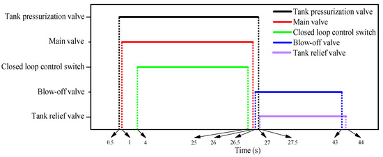 In Equation (16), Pc is the pressure of the combustion chamber (unit: Pa), c* is the characteristic velocity (unit: m/s) obtained by thermal calculation with RPA (rocket propulsion analysis) software, and At is the throttling area of the nozzle throat (unit: m2). In detail, c* depends on the oxidizer-fuel ratio and the combustion chamber pressure. When the oxidizer-fuel ratio is constant, c* and Pc are interacting and coupled. The exact Pc and c* are calculated in four iterations. Specifically, the first step is to set an initial Pc. The second step is to obtain c* by interpolating Pc and the oxidizer-fuel ratio. Next, we use c* to obtain the iterated Pc. Finally, Pc is updated and the program returns to the second step. When the number of iterations is greater than four, the calculation is terminated and Pc is considered to be converged.
