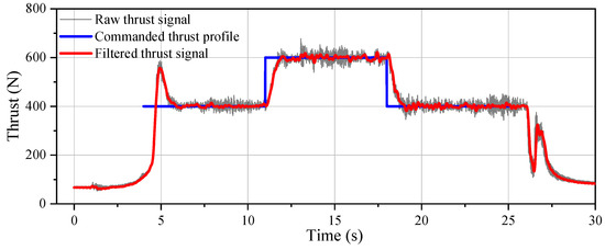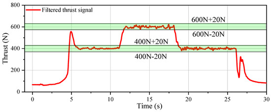 Because the period of control in this study was set to 20 ms, the cut-off frequency of the filter was set to 50 Hz. The filtered curves of the thrust over time were then obtained as shown in Figure 15. The real-time error in the thrust was controlled to within ± 20 N with a steady-state error smaller than 5%.