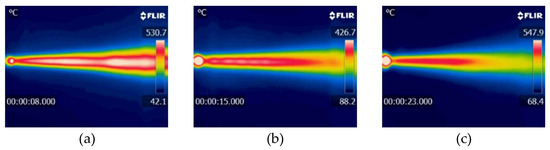 Snapshots of plume exhausting from the nozzle for the hot test at (a) 8 s, (b) 15 s, and (c) 23 s.