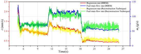 In consideration of the thrust throttling operation of the motor, the reconstruction technique proposed in previous articles [35,36] was referred to in order to obtain the real-time c* and a more accurate regression rate and fuel flow rate, which is shown in Figure 16. Compared with the IRRM method, the OPTMA-FE-L method added real-time information about the thrust and took into account the real-time variation of c*.