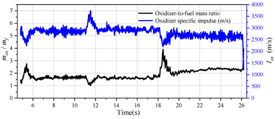As shown in Figure 6, the specific impulse of the oxidizer decreased with an increase in the oxidizer-to-fuel mass ratio by internal ballistic calculation. The initial conditions were as follows: The nozzle expansion ratio was 3; the combustion chamber pressure was 3 MPa. The impact of combustion pressure on the specific pulse was slight reflecting the feature of hybrid rocket motors [31]. Therefore, the impact was not considered. During the operation of the motor, the mass flow rate of the oxidizer remained constant while the ratio of the mixture varied in response to changes in the mass flux. This indicates that the specific impulse of the oxidizer changed during the operation of the motor.