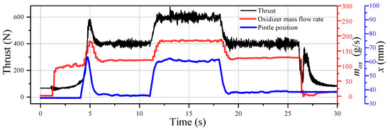 Figure 18 shows curves of the variations in the thrust, mass flow rate of the oxidizer, and position of the pintle over time during the closed-loop throttle test. It also illustrates the thrust signals collected. The thrust generated by 0 s was the initial compression. The purpose of the initial compression was to prevent thrust shock during the ignition of the motor in order to better collect thrust signals. The initial compression had been subtracted in the subsequent data processing. According to Figure 18, the peak thrust at the beginning of ignition occurred due to the delay in ignition. Because the catalytic bed had not been fully preheated and the motor had not completed ignition, the real-time thrust was much lower than the design thrust. Error in the thrust signals received by the controller of the control system was too large, and led to a significant increase in the position of the pintle. This in turn increased the mass flow rate of the oxidizer and the thrust.