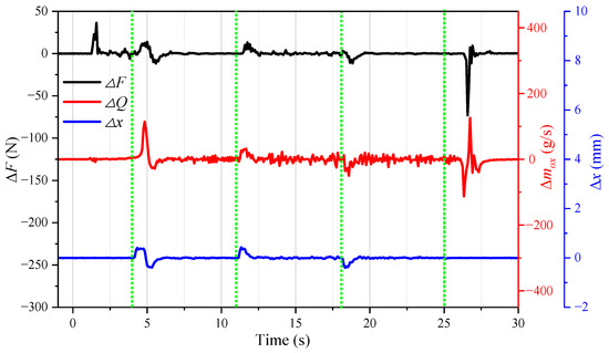 Curves of variations in the increases in the thrust (ΔF), mass flow rate of the oxidizer (Δ), and position of the pintle (Δx) over time in the closed-loop throttle test.