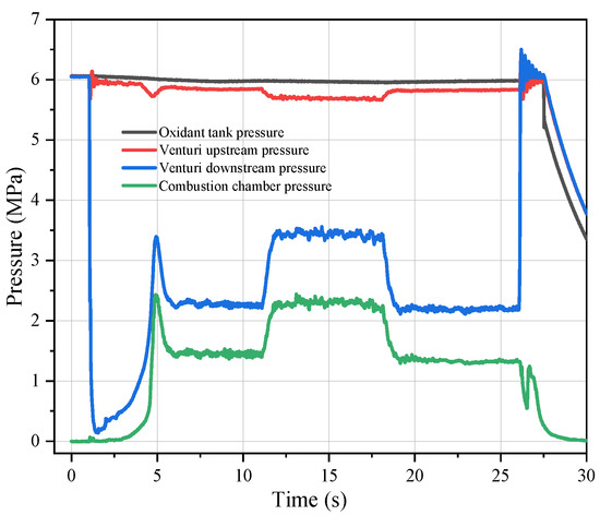 Figure 20 shows the curves of pressure obtained from each pressure sensor during the closed-loop throttle test. Although the downstream pressure of the venturi and that in the combustion chamber changed, the upstream pressure of the venturi did not change significantly, indicating that the variable-area cavitating venturi had effectively isolated fluctuations in the downstream pressure.