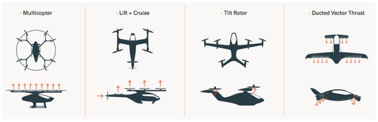 eVTOL aircraft fit into four main categories: lift plus cruise, tilt rotor, ducted vector thrust, and multicopter (Figure 1). The first three categories fall under the powered lift aircraft classification, which includes winged aircraft that are capable of both VTOL and aerodynamic lifts during forward flights. The fourth category belongs to wingless aircraft, specifically multirotor aircraft with two or more lift/thrust units that have limited or no capability for wingborne forward flights. Powered lift eVTOLs can be further categorized based on whether they use a common power plant (tilt-rotor and ducted vector thrust) or an independent power plant (lift plus cruise) for both lifting and forward flights [,,].
