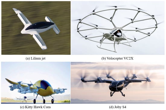 Figure 2. eVTOL categories. - Wingless: This configuration is relatively simple and can be very efficient during vertical take-off, landing, and hovering, due to low disc-loading. However, without wings, multicopters lack cruise efficiency, which limits their application to urban air mobility (UAM) markets only. An example of this category is given in Figure 2b, named Volocopter VC2X []. The latter runs on nine independent batteries, powering 18 electric motor-driven variable-speed/fixed-pitch propellers. The redundancy ensures stability in the event of component failures.