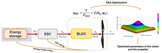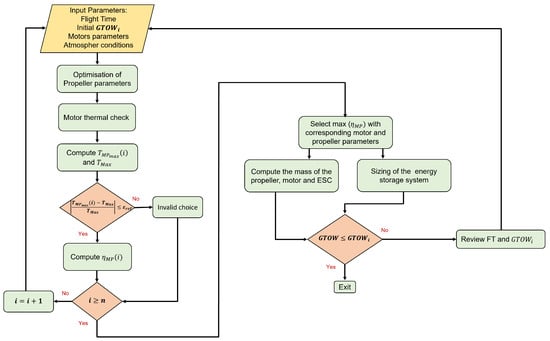 The sizing methodology is based on a combination of analytical optimization techniques and data-based techniques. It takes the following input data: the required flight time, a database of electric motor parameters, including the voltage (), load current (), internal resistance (), and speed constant () for n examples (at this stage, the optimal motor is not known), atmospheric conditions defining the altitude, temperature, and air density, and the initial gross take-off weight (). Subsequently, a global non-linear optimization is performed for each motor/propeller pair using the simulated annealing algorithm (SAA). The objective of this optimization is to maximize the pair motor/propeller efficiency, also known as specific efficiency . This efficiency index is widely used by industrial manufacturers, such as T-motor and Mejzlik [,] to measure the efficiency between the motor and the propeller. Constraints are applied to the propeller geometry, specifically the diameter () and the pitch angle . The optimized motor/propeller pair obtained from the optimization allows for checking the condition to avoid motor overheating, as stated in Equation (32). Subsequently, the maximum thrust generated by the optimized motor/propeller pair was computed using Equation (34). By utilizing the maximum thrust imposed by as indicated in Equation (35), a filtering condition was established based on the relative error between and , as shown in Equation (36). This filtering condition allows for an initial selection of the motor/propeller pairs. Subsequently, the selection of the optimal motor/propeller pair was determined based on the maximum specific efficiency achieved. The sizing of the energy sources was then performed to maximize the flight time. Finally, the last step of this sizing methodology involved verifying whether the total take-off mass, obtained using statistical mass models for each component of the propulsion chain based on supplier data, was within acceptable limits. A detailed flowchart of this sizing methodology is provided in Figure 3. The specific efficiency maximization allows making a rapid and precise choice for each component in the propulsion chain. Figure 4 presents an overview of the different steps, based on which, the electric propulsion chain sizing is performed. The fact that the validation step was based on a reduced-scale multirotor drone with a of 15 kg explains the choice of the data scale used for the optimization of input data motors and regression models.