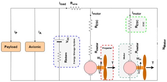 The physical model of the propulsion chain, of an eVTOL multirotor aerial vehicle (with n arms) is presented in Figure 5. Each propulsion chain is composed of a propeller, a motor with its equivalent internal resistance, an ESC represented as a simple resistor, and an energy storage system modeled as an open circuit voltage with a series resistor. In this configuration (Figure 5), the energy storage system supplies the n propulsion chains. The modeling process will aim to establish a relationship between the propulsion chain components, especially between the propeller and the motor, in order to formulate the optimization problem. In this case, each component will be modeled in a steady state.