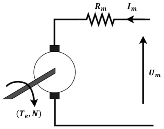 Electric motors used in eVTOL applications are primarily of two types: brushed DC motors (BDC) and brushless DC motors (BLDC). BLDC motors, known for their low resistance and high efficiency, are commonly used in heavyweight multicopters. They can be further categorized into two types: outrunner (OR) and inrunner (IR), based on the rotating part of the motor. Presently, OR BLDC motors are considered a preferable choice over IR motors. OR motors have lower Kv (rpm/V) values compared to other types of BLDC motors. This means they operate at lower rotational speeds but generate higher torque, which allows for direct propeller coupling (no gearbox) []. (rpm/V) is the speed constant, which will determine the rotation speed of the electric motor when no-load and stable voltage is supplied. This is an important element for choosing a motor that is compatible with the power supply and propellers to achieve the required speed. In Figure 6, (V) is the supply voltage, (A) is the current absorbed by the motor coils, () is the motor equivalent resistance, (Nm) is the electromotive torque produced by the motor, and N (rpm) is the shaft angular velocity. The equations describing the motor electric model are [,]: