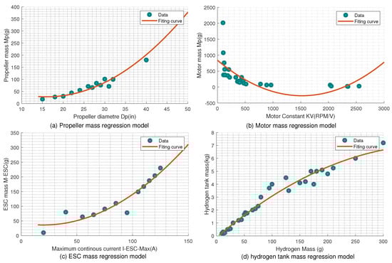 For the hydrogen tank, a type 4 tank was selected among the gaseous hydrogen tanks. Liquid hydrogen is 800 times less in volume and has a higher energy density than gaseous hydrogen, but it must be kept at a low temperature, which limits its use in HFC UAVs [,]. A regression model that estimates the hydrogen tank mass (kg), based on the amount of hydrogen (g) required for the flight mission, is established as shown in Figure 7d. The data are based on the tank type, e.g., such as types 3 or 4 [], and this model can be expressed as: