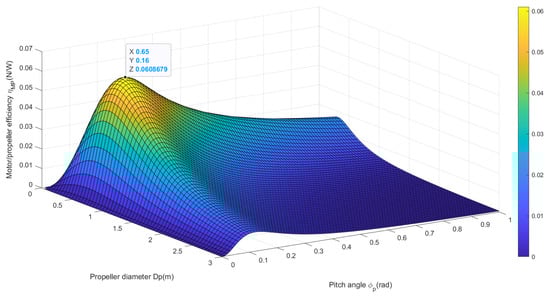 For a fixed thrust imposed by the , the motor/propeller efficiency evolution in terms of propeller parameters is given in Figure 8. Through this figure, it is noticeable that the motor/propeller efficiency presents a single attraction basin, enabling the rapid identification of the point that maximizes the objective function.