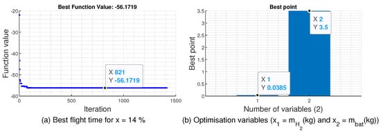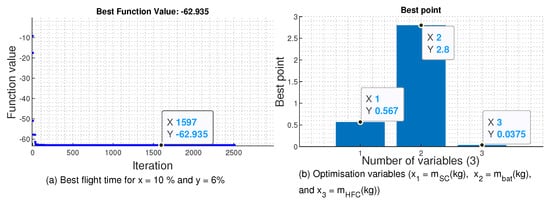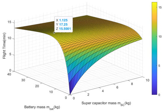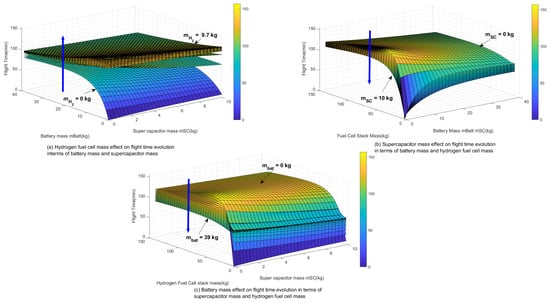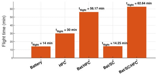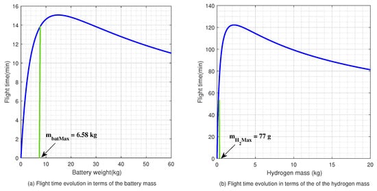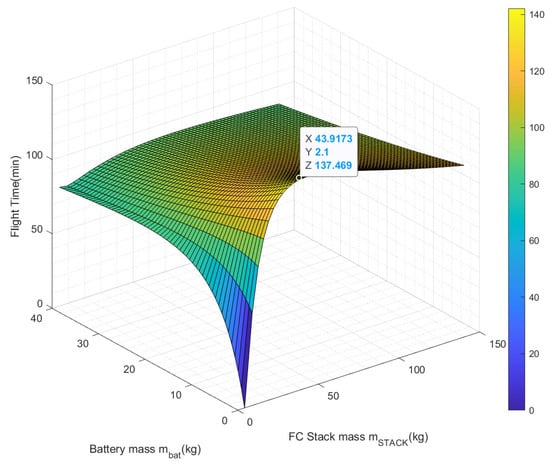 where , , , and are, respectively, the ratio of the cross-sectional area to the electrode area of a single cell (fixed at a value of five), the area density of a single cell (fixed at 1.57 kg/m), the ratio of the BOP weight to the HFC weight (with a value that varies depending on the HFC configuration; in this paper, a value of 0.2 is considered), and the overhead fraction to account for gaskets, seals, connectors, and endplates (fixed at 0.3). The flight time in the case of a fuel cell is given by the following expression: