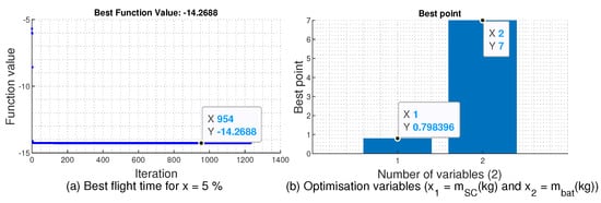 where and are, respectively, the battery power density (Wh/kg) and the battery mass (kg). Thus, for a given embedded LiPo battery mass , and a load, an equivalent flight time is determined. Once the battery mass (kg) is located with an objective to maximize the flight time with the constraint, the battery capacity (mAh) is computed using the following equation: