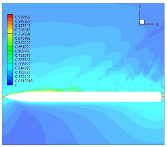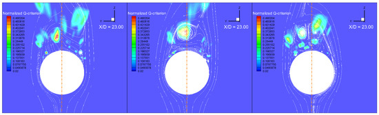 Figure 19 shows the normalized Q-criterion and pseudo-streamlines at section x/D = 23.0 (rear body, flow Region 1), in which the flow has a similar behavior to that of section x/D = 25.0. These plots correspond to three different times (t = 2.505, 2555, and 2.605 s) within a period of 0.1 s again. There is a complex vortex structure with vortices of different scales. The nature of the fluctuating flow leading to a zero net side force within the period is shown here. However, the differences between the contours at t = 2.60 s (right side of the figure) compared to t = 2.505 s (left side of the figure) indicate the complexity of the flow at the rear part of the body.