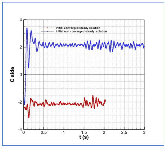 For the reference configuration of the fineness ratio of L/D = 15, an unsteady solution obtained over 2.1 s with the RSM model was used as the initial solution. The calculation was then resumed using the RSM-SAS model, computing four additional seconds. The solutions of the sectional side and normal force coefficients for several points in time over the last 0.1 s of the interval are shown in
