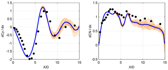 Figure 6a. The thick blue line represents the discrete average curve, and the solid black circles are the experimental sectional force coefficients for the reference configuration of the fineness ratio of L/D = 15. From the visibility of the orange lines, we can conclude that Region 3 extends approximately up to x/D ~ 5. The rest of the body corresponds to Region 2, being responsible for the small oscillations that appear in