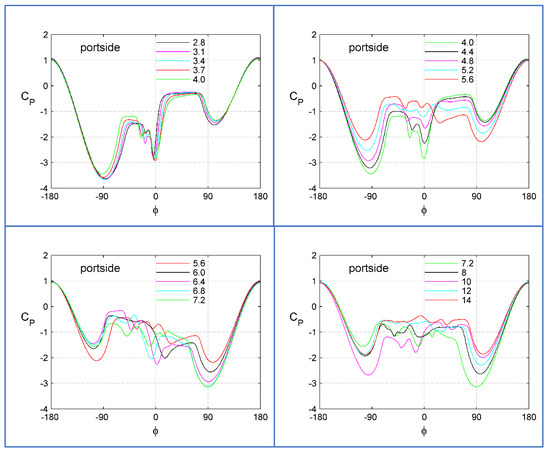 23]. In this section, the difference in minimum pressure coefficient between the port and starboard sides reaches its maximum. There is a dominant vortex 2 and an incipient counter-rotating vortex 3. The top right figure shows the pressure coefficients at cross sections x/D = 4.0 to 5.6. As shown in