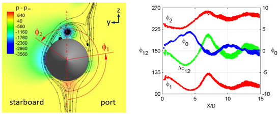 Figure 15 (left) at cross-section x/D = 3.67. The pressure contours and the pseudo streamlines are plotted. The attachment point is defined as the minimum velocity point, while the separation points are those where the boundary layer separates. In the figure, the angles Φ
