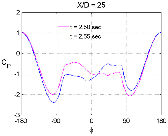 Figure 20 shows 20 instantaneous pressure coefficients in circumferential direction during a period of 0.1 s and their average at several x/D cross sections. The first two sections (x/D = 3.00 and x/D = 9.00) belong to Region 3 (the steady flow region), the next two sections (x/D = 12.0 and 15.00) belong to the unsteady Region 2 (with oblique vortices), and the last two sections (x/D = 20.0 and 25.00) belong to the unsteady flow Region 1, in which the alternating vortex Karman street pattern is appreciated. The legend