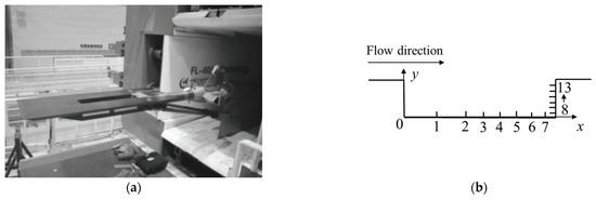 The calculation of aircraft surface noise is a near-wall noise calculation. The M219 cavity [] was used to verify the near-wall noise calculated using the NLAS method. The 0.6 m × 0.6 m transonic/supersonic wind tunnel (FL-23) of the China Aerodynamics Research and Development Center was used for cavity noise measurement. The cavity for the wind tunnel test is an all-metal flat model, and the specific size is L × W × D: 508 mm × 101.6 mm × 101.6 mm, and the length–depth ratio of the cavity is five. Several pulsating pressure sensors were arranged at the bottom and rear walls of the cavity. The cavity experimental model and sensor position are shown in Figure 1, and the longitudinal and vertical positions of the relative cavity length and depth are listed in Table 1.