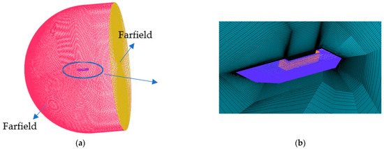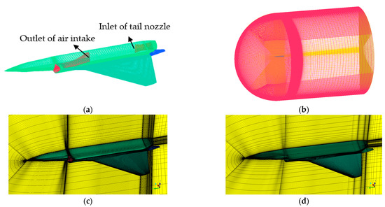Considering a certain aircraft as the research object (as shown in Figure 9), this study established a geometric model of the aircraft, including the air intake and tail nozzle, and divided it into structured grids. The engine is a single-tail nozzle model with twin inlets, and the mesh model of the aircraft noise calculation is shown in Figure 10. The aircraft mesh model is shown in Figure 10a, and the computational domain mesh model is shown in Figure 10b. Using the NLAS method to calculate aircraft surface noise, the RANS mesh can be used to simulate the propagation of pressure pulsation, or the data can be interpolated on an independent acoustic mesh. By interpolating the RANS statistical data into a separate acoustic mesh, noise can be solved using more isotropic elements. Owing to the relaxation of the near-wall grid requirements, the y+ value can be much greater than one. Therefore, in the direction perpendicular to the wall, the fine boundary layer grid is no longer required, and the total number of grids and calculation time are significantly reduced, which is also an advantage of the NLAS method. Two sets of calculation meshes were used herein. Figure 10c shows the RANS mesh with 24.4 million elements, and Figure 10d shows the acoustic mesh with 9.1 million elements.