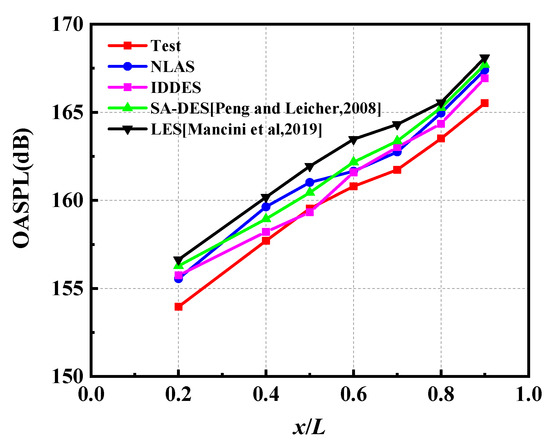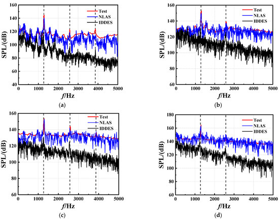 The overall sound pressure level (OASPL) of the monitoring points in the cavity with Ma = 0.85 is shown in Figure 3. It can be observed from the figure that the OASPL calculated using the NLAS and IDDES methods is consistent with the experimental results, and the error is within 2 dB. Compared with the calculation results in other literature [,], the calculation accuracy of the NLAS and IDDES methods is similar to the DES method and slightly higher than the LES method. Figure 4 shows the experimental and simulation results for Ma = 3.0. The NLAS method accurately calculated the sound pressure level of the cavity noise within 5000 Hz. The peak value of the SPL and the frequency corresponding to the peak value were consistent with the experimental results, indicating the effectiveness of the NLAS method in the calculation of supersonic near-wall noise. The SPL calculated by the IDDES method decayed with an increase in frequency. The frequency corresponding to the peak value of SPL was consistent with the test results, but the peak values of SPL were not consistent with the test data.
