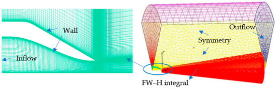 The ARN2 acoustic reference nozzle developed by the NASA Glenn Research Centre [] was used to verify the jet noise. It is an axisymmetric convergent nozzle with an outlet diameter of 2 inches. The 1/4 mesh model of the calculation domain and the nozzle mesh model are shown in Figure 5. The height of the first layer of the grid on the wall was 0.005 mm, making y+ approximately equal to one. When calculating the flow field, the inlet was the pressure inlet boundary, the outlet was the pressure outlet boundary, and the wall was adiabatic and non-slip. The near-field jet noise was solved using the NLAS and IDDES methods separately. When the NLAS method was used, the inlet and outlet were changed to the NLAS inlet/outlet boundary, and three absorption layers were added. The far-field noise was solved using the FW–H integral surface method. The mesh is refined in the direction normal to the wall, and the FW–H integral surface is refined compared to its surrounding space mesh.
