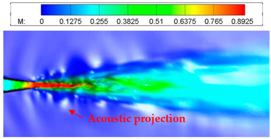 The cloud diagram of the axial velocity of the nozzle calculated by the simulation is shown in Figure 7. The air velocity near the nozzle was the highest, and that away from the nozzle decreased. The acoustic projection surface is shown in Figure 7, which shows that the simulation methods can calculate the sound propagation process. The experimental and simulation data of the far-field noise at 90° and 150° are shown in Figure 8, and the simulation results are consistent with the experimental results.