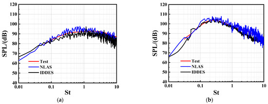 Since the 1970s, several experimental studies have been conducted on the aerodynamic noise of airframes. Through the analysis of large amounts of experimental data, empirical formulas between the aerodynamic noise of the airframe and aerodynamic shape, flight state, and flight conditions have been proposed and applied in engineering practises. For the aerodynamic noise of the entire aircraft, the main method still depends on semi-empirical methods of experimental measurement, which include aircraft flight and wind tunnel model measurements. For instance, the measurement of the G550 aircraft by Khorrami and Lockard [] at the NASA Langley Research Centre confirmed that the aerodynamic noise of the airframe is the main source of an aircraft’s noise in the landing state. The wind tunnel model experiment was also improved. Stoker et al. [] measured the noise of the Boeing 737 half model in the National Transonic Facility wind tunnel successfully, which was the first measurement of airframe noise in medium- and low-temperature environments. With the support of new experimental data, new semi-empirical methods are being developed. Blacodon [] proposed a spectral estimation method (SEM) based on phased array measurement. Scarselli et al. [] used a semi-empirical method based on the Engineering Sciences Data Unit (ESDU) database to calculate the airframe noise of civil transport aircraft.