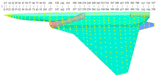 In the RANS calculation, the inflow Mach number was 1.6, the flight altitude was 11 km, and the angle of attack was 2.3°. The outlet of the air intake was the mass flow boundary condition, and the inlet of the nozzle was a characteristic-based boundary condition. According to the isentropic flow relation of aerodynamics, the mass flow rate at the outlet of the air intake was 42.59 kg/s. The static pressure and temperature at the nozzle inlet were 201,025 Pa and 1845.2 K, respectively, to simulate the air pressurisation process in an actual engine. The wall of the aircraft was non-slip. The cubic k–ε turbulence model was used for the calculation. After the statistical average values of the stress tensor and heat flux were obtained, they were interpolated into the acoustic mesh, and the turbulence was manually reconstructed according to the statistical average results. During the noise calculation, the unsteady calculation was started, the time step was 5 × 10−5 s, the flow solution time was 1.5 s, the maximum number of iterations in each time step was 10, and a new boundary was set as the absorption layer boundary. The monitoring points were set on the surface of the aircraft; the locations of the monitoring points are shown in Figure 11.