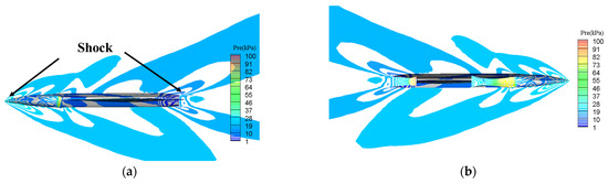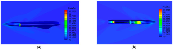 Figure 12 shows the pressure of the aircraft during supersonic flight. On the surface of the aircraft, the pressure at the nose and leading edge of the wing is high. Inside the fuselage, the pressure at the entrance of the air intake and the nozzle is high. The inlet of the air intake is greatly impacted by the pulsation of the airflow, and its characteristics need to be analysed later. The shock waves at the nose and tail can be seen in Figure 13: attachment shock wave at the nose and expansion wave at the tail.