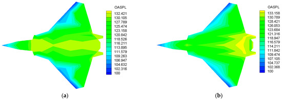 The OASPL at each monitoring point can be calculated. Figure 14 is the cloud chart of the OASPL on the upper and lower surfaces of the aircraft made by the program. It can be observed from the figure that the OASPL at the nose and leading edge of the wing was relatively small and that the air intake and tail nozzle was relatively large. During the flight, the airflow on the aircraft surface gradually transitioned from attached to separated flow, the airflow pulsation increased, and the OASPL of the fuselage gradually increased from front to rear. Owing to the existence of supersonic jet noise at the tail nozzle, the OASPL was the largest, reaching 145 dB. Figure 15 is the cloud chart of the OASPL on the aircraft surface without jet noise. Compared with that with jet noise (Figure 14), the OASPL at the front of the fuselage was almost unchanged, the OASPL decreased only at the tail nozzle, and the maximum value became 133 dB. This shows that the surface aerodynamic noise is the main acoustic source when the aircraft is in a supersonic cruise state, and the jet noise has little effect on the sound pressure level at the front of the fuselage but only contributes to the OASPL at the tail nozzle of the fuselage. The intensity of pressure pulsations from the engine exhaust in the tail section is 93.3% of the total intensity of pressure pulsations.