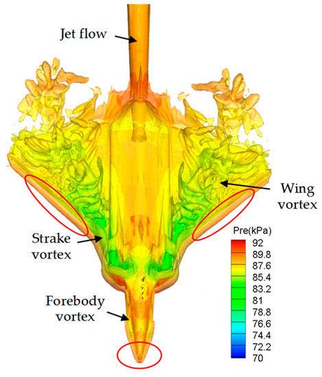 Figure 16 shows the isosurface of the instantaneous Q = 300 criterion of the aircraft in cruise states. The isosurface’s instantaneous Q = 300, related to the vortex structure, was coloured by the absolute pressure. The Q isosurface can significantly express the vortex structure of the flow field. It can be seen that the forebody vortex bent outwards near the strake vortex along the front of the nose and finally met the strake vortex near the wing body fusion, which was also the location of vortex breakdown. After the vortex broke, it continued to move backward. Therefore, the pressure change on the upper surface of the fuselage was mainly caused by the change in the vortex structure. In actual flight, the vortex structure is helpful to increase the negative pressure on the upper surface of the fuselage and increase the lift. The aircraft in this study has no vertical tail, and the pitching balance and control are completed by the wing’s trailing edge aileron. There is no vertical tail buffeting problem, which further enhances the stealth and safety performance of the aircraft.