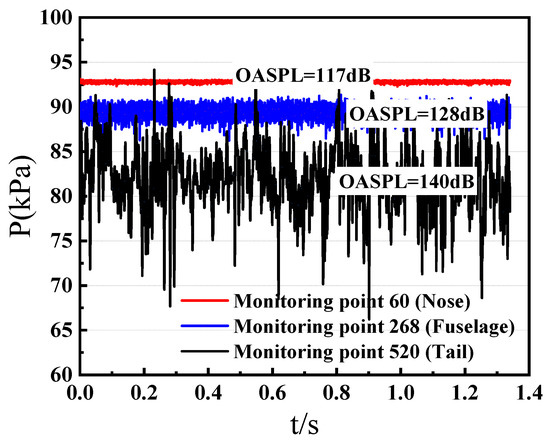 In Figure 16, the elliptical region is the nose and the leading edge of the wing. The region is subject to large pressure, but the turbulence fluctuation is small, so the sound pressure level in the elliptical region is small, as shown in Figure 14. Extract the pressure fluctuation curves of monitoring points 60, 268, and 520, as shown in Figure 17. It can be observed that the pressure of the fuselage decreases gradually from front to back along the fuselage, while the pulsating pressure ΔP increases gradually and the corresponding OASPL increases gradually. It can be seen that the SPL is independent of the pressure but relates to the pressure fluctuation.